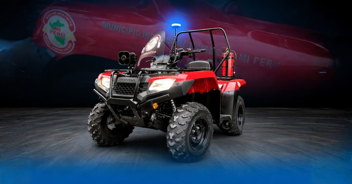 Equipamiento de cuatrimoto 4x4 para patrullaje municipal con sistema de iluminación de emergencia.