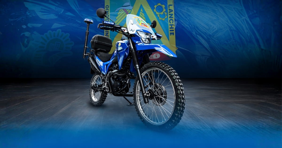 Motocicleta equipada para patrullaje municipal con sistema de iluminación de emergencia y accesorios operativos.