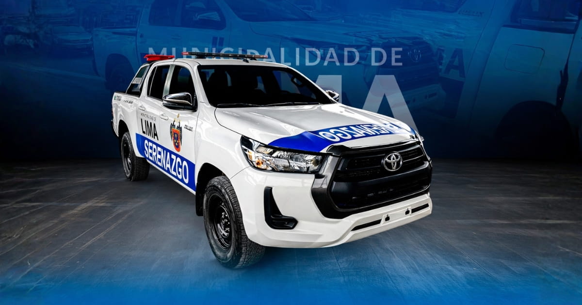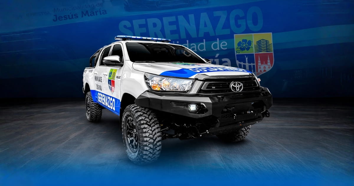 Camioneta Toyota Hilux equipada para serenazgo municipal con sistema de iluminación de emergencia y acondicionamiento operativo.