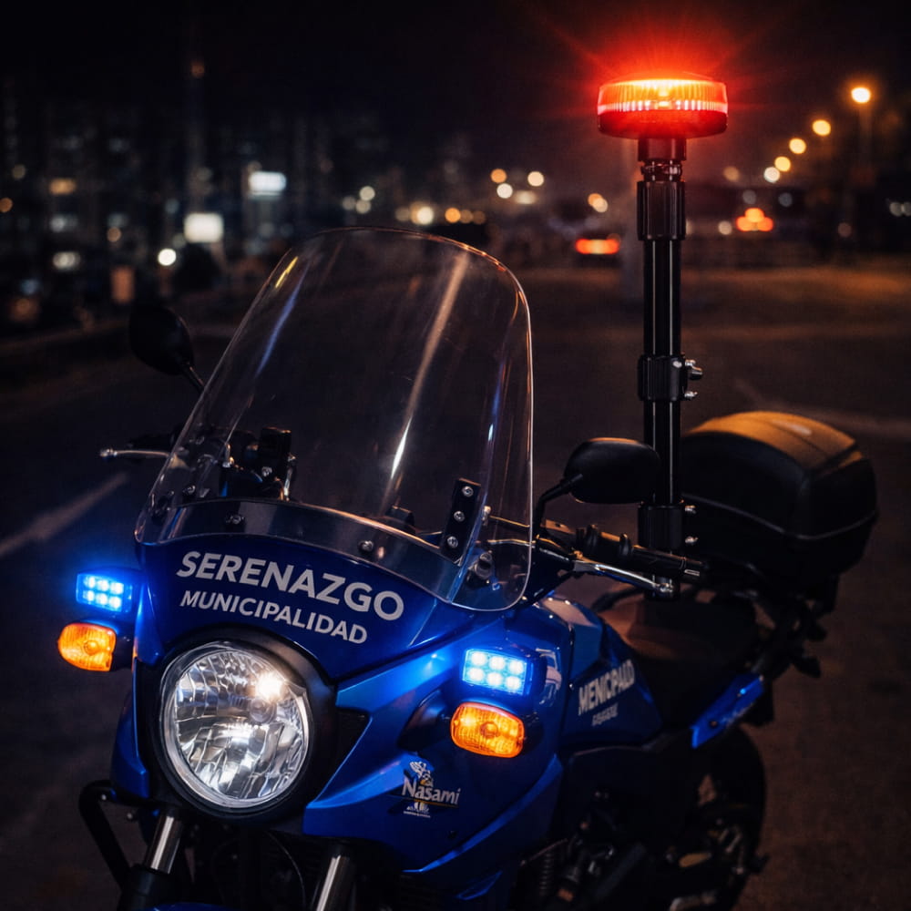 Es una solución ideal para unidades de serenazgo, seguridad privada o motocicletas operativas que requieren alta visibilidad y confiabilidad continua.